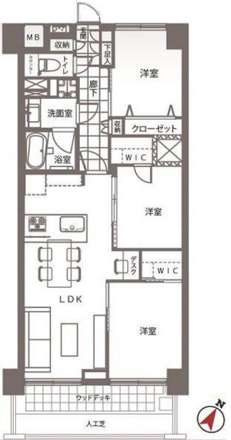 手前はウッドデッキ、奥側は人工芝になっていますよ