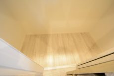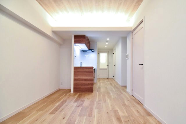 入口からの通路とキッチンとを兼ねることによって、凸凹の少ない四角形のリビングダイニングを実現しています。立体的に付加された天井には間接照明が設置され、優しい光がお部屋を照らしています。