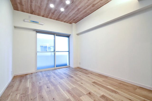 天井に張られた木目パネルが包み込まれるような落ち着きを感じさせてくれますね。東向きの窓はバルコニーに面しています。