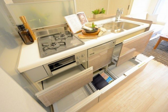 この通り、がっつり奥まで開けられるひきだしなので、大きいお鍋や重たいフライパンを出し入れするのにも楽々、ですねヽ(゚▽゚*)