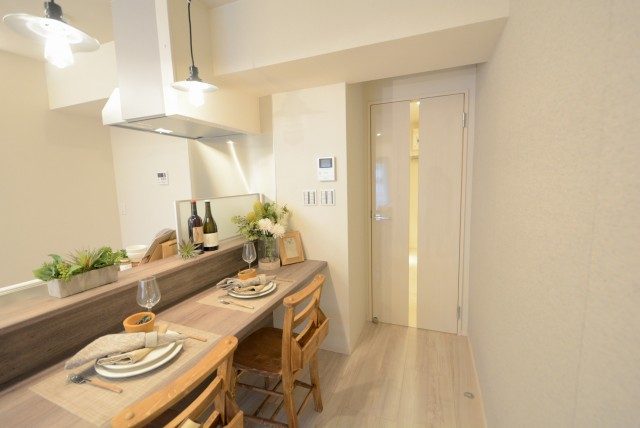 ダウンライトで照らされたこちらの壁わきには、このように小物をかざるもよし、テレビ台にするもよし、ですね(*´ω`*)