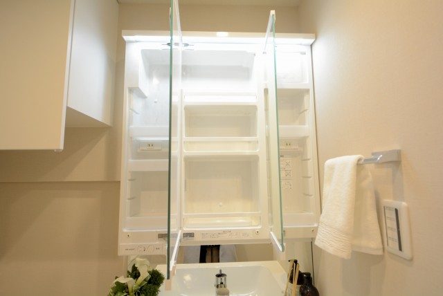 鏡の裏側はがっつり収納棚なんです!!