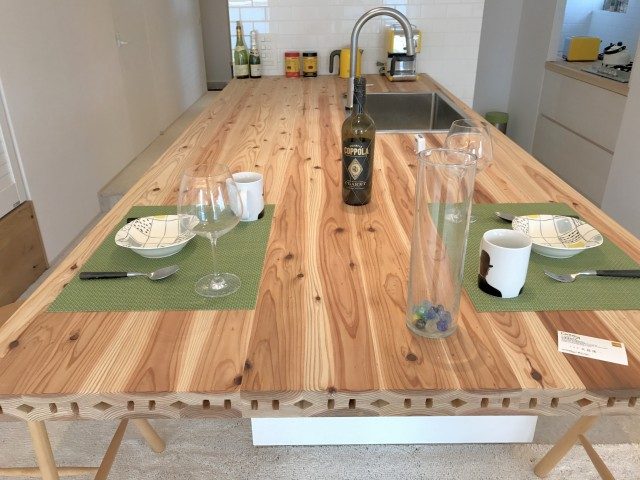 ダイニングテーブル一体型でキッチンの天板は杉の無垢材で出来ています。