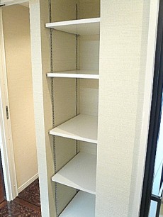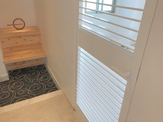可動式の棚、リネン庫です。お隣は浴室、すぐにタオルがとれ、サニタリールームのあちこちに水滴ポタポタは防げそうです!