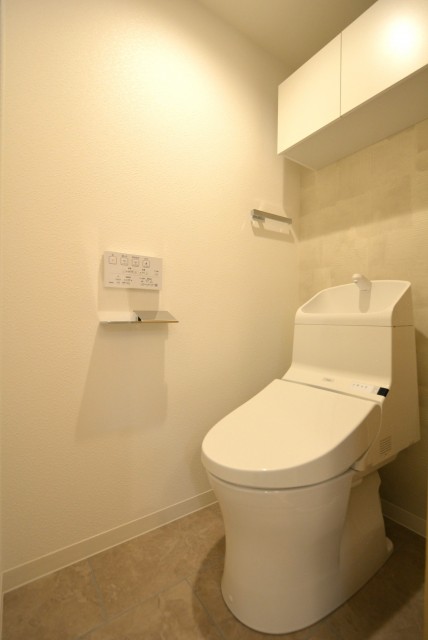 トイレはウォシュレット付き。吊戸棚がスッキリと細見な分、トイレットペーパーは