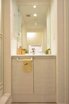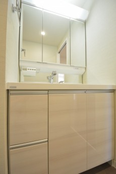 洗面台は三面鏡付き。上部に照明も付いて鏡を使う時に影になったりもしません。