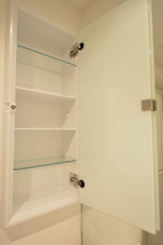 鏡の左横には洗面まわりのものをいれて置けるキャビネットがつくられています。