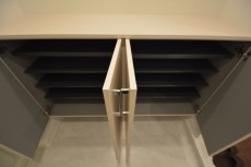 シューズボックスはトールタイプで収納力抜群。棚の高さを調節すればブーツなどの背の高い靴でも収納可能ですよ。