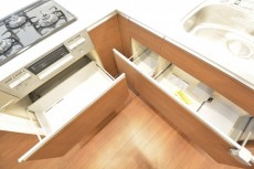 調理台下には収納と食器洗浄乾燥機。引き出しタイプの収納はびっしり詰めても出し入れしやすいのがいいんですよね。洗い物を食洗機に任せれば、食後はのんびり過ごせそう♬