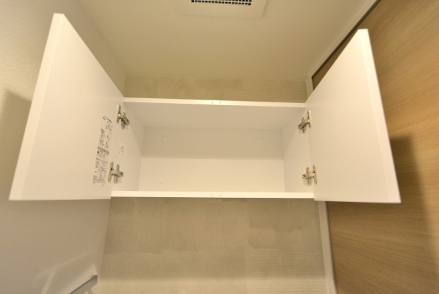 もちろん洗浄便座付き。INAX製のシャワートイレです。トイレットペーパーなどの収納に便利な、吊戸棚も付いていますよ。