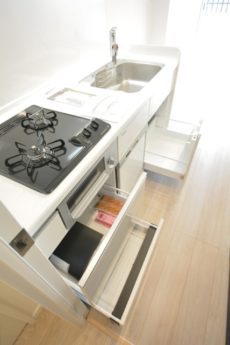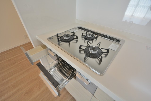 コンロは二口。今は電子レンジを駆使したレシピもたくさんあるので、コンロは二つもあれば十分な気もします。グリルもお魚だけじゃなく、野菜や肉など何を焼いても美味しいんですよ(^^)