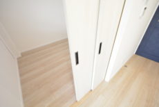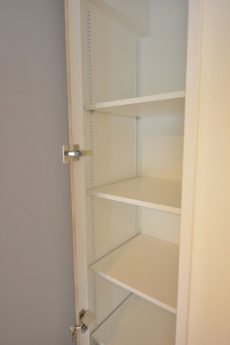 廊下に出てすぐには収納がありました。中がひと目で把握出来て、様々なストックなどを入れるのに便利です。