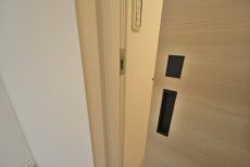玄関ドアの上が丸くカットしてあったり、玄関灯が素敵なステンドグラスだったり、さすがクラシックマンションですね。新築のマンションではもう見る事は出来ないと思います。ドア横にはテレビモニター付きインターホンが設置されていて、お部屋の中から訪問者を確認する事が出来ます。映像でチェックしてから応対するかを決められるので、セールスなどにつかまる事ももうありません。