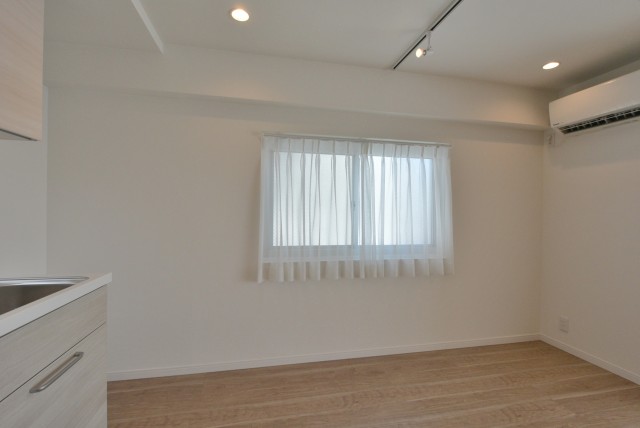 L字型のお部屋でキッチンは独立した感じ。リビング・ダイニングが正方形に近い形で残るので、レイアウトには少し工夫が必要かもしれませんね。ダイニングセットを少し小さくしてリビング部分を広く残したり、逆にダイニングを充実させてリビングにはソファーなどを置かないようにしたり。いろいろ考えるのも楽しいですよね(^^)