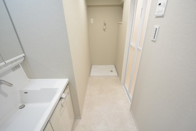 洗面室には洗面台の他に、洗濯機スペースと浴室がまとまっていて、脱衣所も兼ねています。