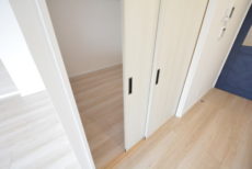 玄関を入ると広い廊下が伸びていました。広い上り口は荷物が多い時などにとても助かります。真っ白な中に正面ドアのブルーが印象的。白とブルー、マンションのイメージそのままですね。