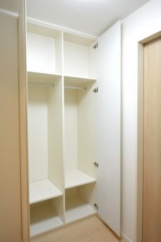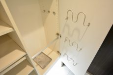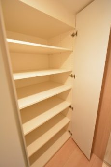 左側や廊下右側にも収納棚があって収納力は抜群です。