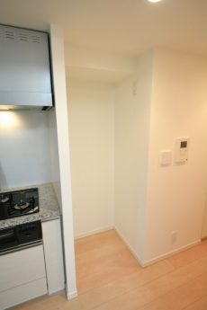 調理台右には冷蔵庫スペース、左には収納棚。冷蔵庫のサイズには注意しましょうね。