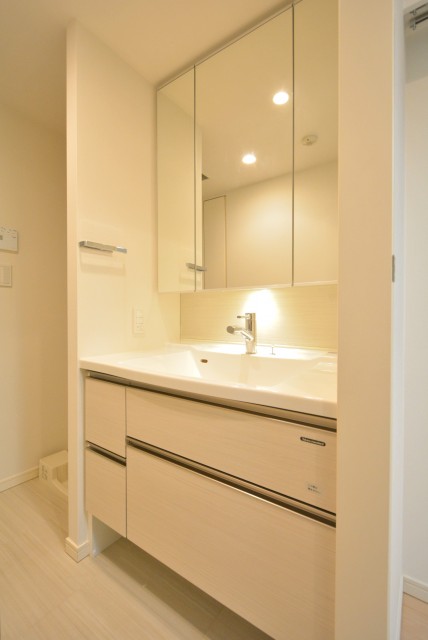 三面鏡付きの洗面台。真っ白で清潔感がありますね。