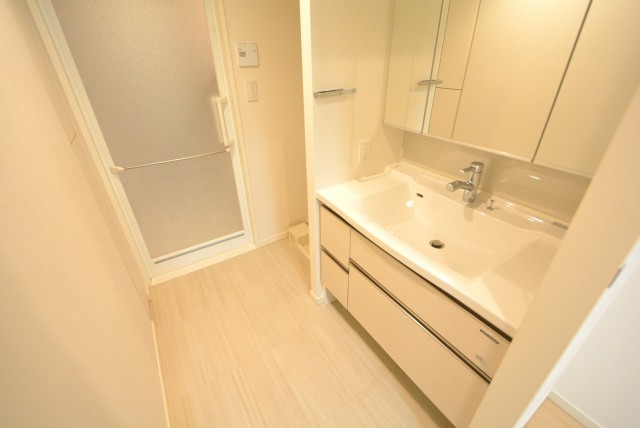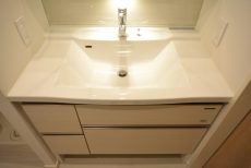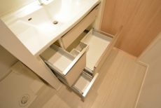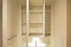 収納は洗面台下と鏡裏のキャビネット。キャビネットは、細かい物が多くなりがちな洗面周りにピッタリです。