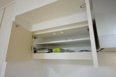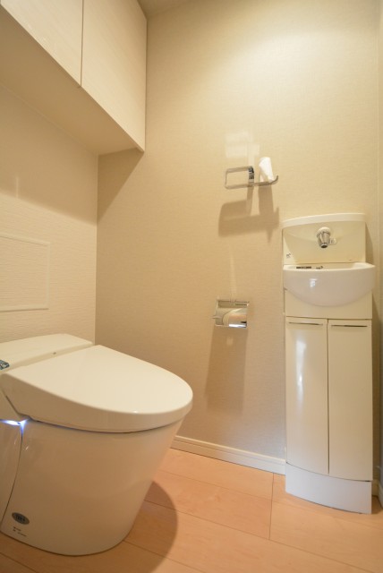 LIXIL製の温水洗浄便座付き。吊戸棚は良く見るタイプより大きめです。低い所は出し入れがし易くていいですよね。