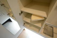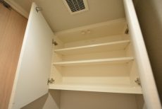 手洗いボウルの下は収納になっていました。トイレブラシや洗剤など、吊戸棚にはしまいにくい物があるので助かります。