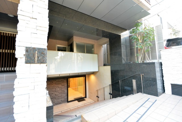 こちらが今回ご紹介する『THEパームス渋谷常盤松』ゆるい坂の途中に建つスタイリッシュな建物です。平成25年6月築ですので、まだ建物も綺麗ですね。