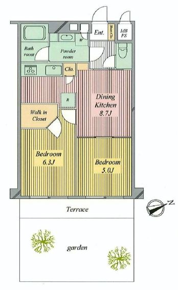 東向きの2DK+WIC 46.64㎡ テラス5.5㎡・専用庭23㎡