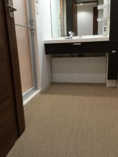 廊下に戻って、洗面室とバスルームのお部屋です。紐を編み込んだような涼しげな床です。
