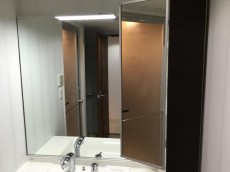 入って右側に洗濯機置き場・洗面化粧台・リネン庫が一列に並び、正面がバスルームになります。