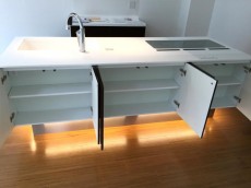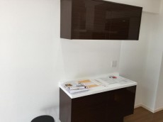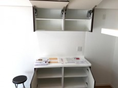 キッチンの背面に収納があります。上下に分かれていて、間はカウンターになっています。