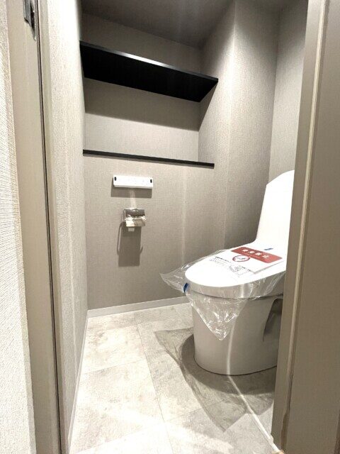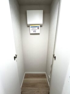 トイレはもちろんウォシュレット付。上部に棚がありますので、トイレットペーパーの