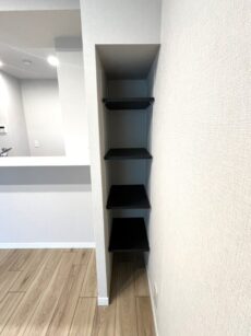 洗濯機置き場の横にも棚があります。こちらにはバスタオルや洗剤、シャンプー