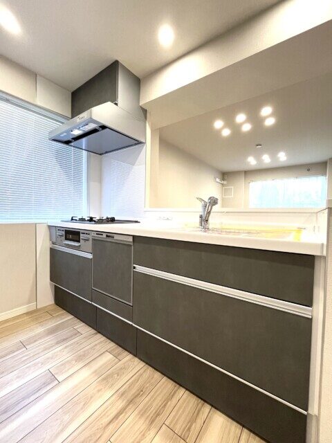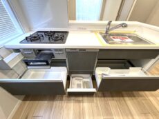 収納は出し入れのしやすいスライドキャビネット。ぎっしり詰めても中身のチェックがしやすいのも嬉しいですね。食器洗浄乾燥機が付いているので洗い物はお任せして食後はのんびり過ごしましょう!