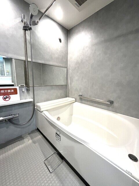 白×グレーでまとめられたスタイリッシュな浴室。気持ちを落ち着けて一日の疲れを癒すのにぴったりな空間です♪