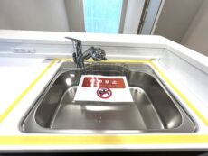 は浄水器一体型、上部には耐震ラッチ付の吊戸棚が設置されているので、お気に
