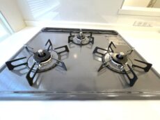 水栓は浄水機能一体型。コンロは3口、グリル付き◎