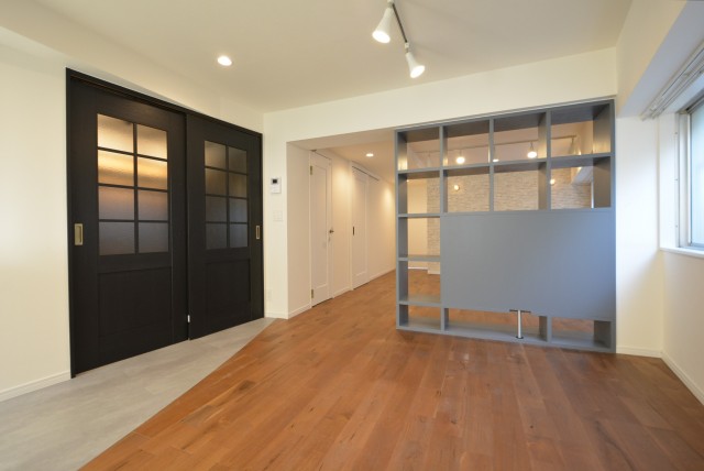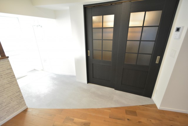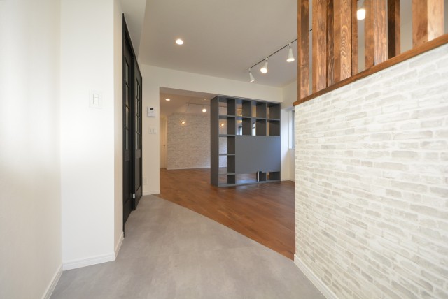 玄関から左を向くと、そこはもうお部屋の中です。扉が無いんですね。床の素材でお部屋との境界をイメージさせています。