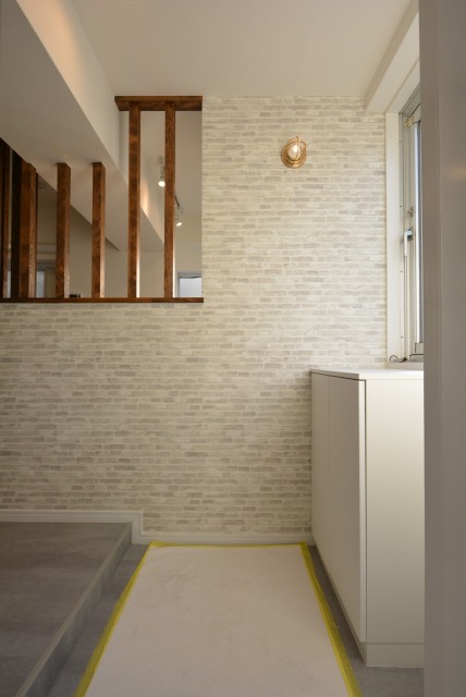 玄関ドアを開けると、正面は壁になっていました。右側からは光が入ってきていてとても明るい玄関です。