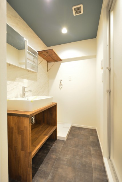 トイレのお隣は洗面室。脱衣スペースを挟むように洗濯機置場、洗面化粧台、バスルームがあります。こちらもトイレと同じくモノトーン調。