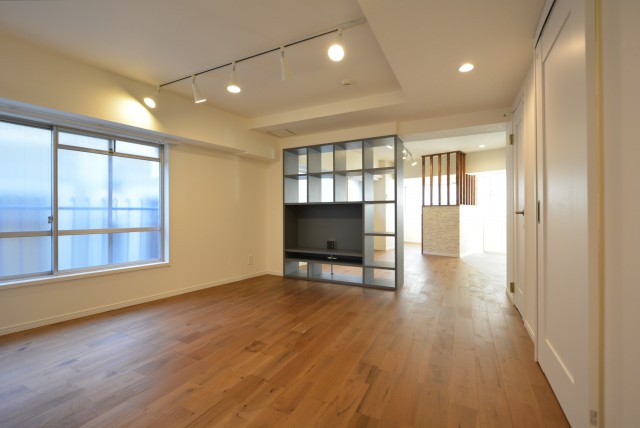 縦に長いお部屋を、TVボードが仕切っています。背板が無い部分がある事で奥への広がりも感じられますね。
