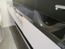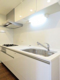 浄水機能付き水栓、3口コンロ、人造大理石トップに上下に収納たっぷりとスペックもグーです。白だとこまめにお掃除する習慣がつきそうですね♪