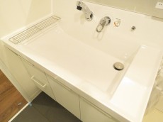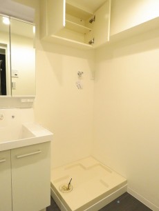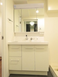 洗面化粧台と洗濯機置場はお隣同士。鏡の裏、引き出し、上の吊戸棚と収納スペースが豊富なのがうれしいですね。ゴチャゴチャしがちな水廻りもスッキリ片付けられそうです。