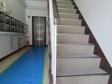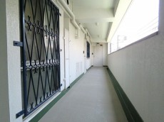 エントランスを入ると奥にエレベーターがあり、横が管理人室(巡回管理)になっています。共用廊下は外廊下です。