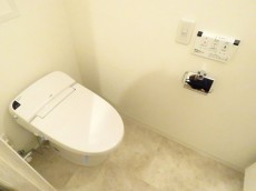 トイレは見た目スッキリのタンクレスタイプ。ウォシュレットと壁面に吊戸棚がついています。
