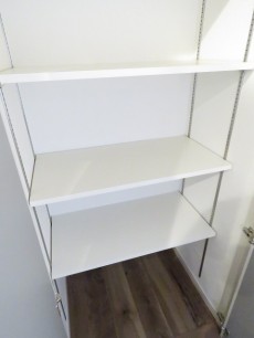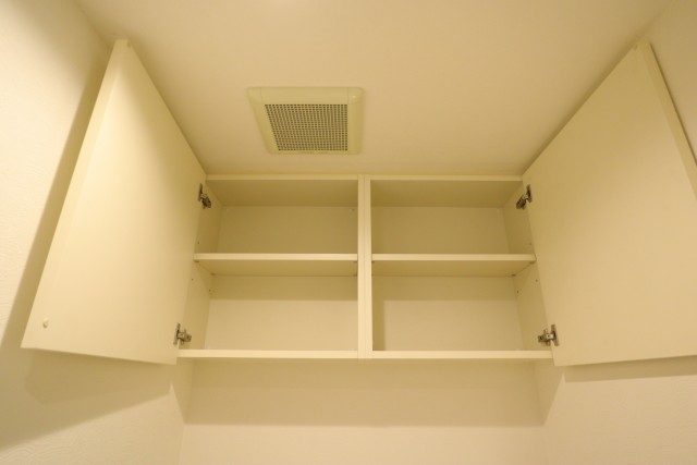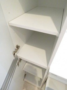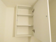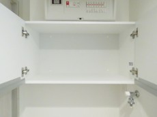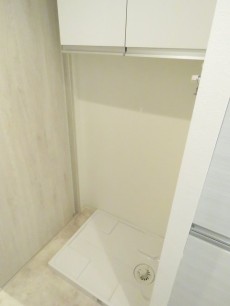 洗面化粧台のお隣は洗濯機置場。ここにも収納が設置されています。