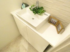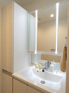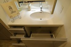 洗面化粧台は鏡の裏、引き出し、横のリネン収納棚など小物の収納スペースが豊富。ゴチャゴチャ散らかりがちな水回りもスッキリ片付けておけます。