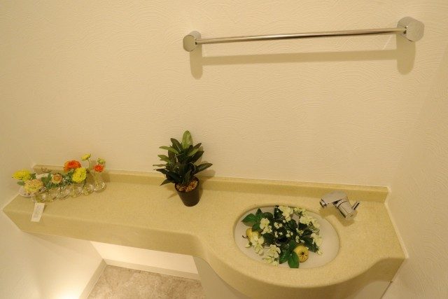 トイレはLIXIL製のタンクレス&洗浄機能一体型。ちょっとした物を飾ってインテリアを楽しめる手洗いカウンターも付いています。
