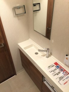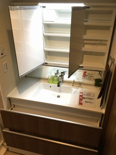 洗面台はお部屋の扉と同じトーンの木調パネルを使った大きな三面鏡付きの洗面台です。