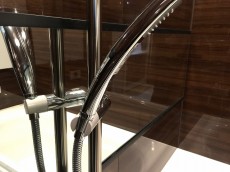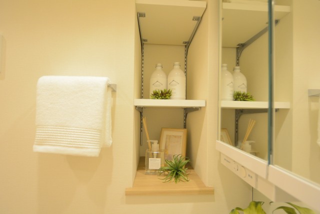 ミラー横にはシャンプーなどのボトルもキレイに並べて置ける棚があり、清潔感のある空間を保てますね◎モザイクパターンの床は、水はけが良く、すばやく乾燥します